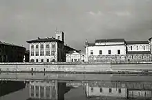 View of the lungarno Mediceo with Palazzo Medici (left) and the church and convent of San Matteo, in a photo by Paolo Monti, 1973