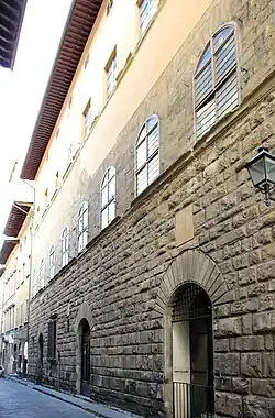 The two brother Alessandro and Bartolomeo degli Albizi (after 1372 called 'degli Alessandri') built the palace after the purchasing of three lots between 1368-72 and probably completed by 1376. During the Ciompi rebellion of 1378 the palace was ransacked and arson, the west side of the structure collapsed (the lack of rustication is still visible today).[1] The Alessandri (and Albizzi) had been prominent Guelf families linked to the wool production, and thus the Guild of Wool. The coat of arms of the Alessandri was a two heads lamb on a blue field with a gold crown and palm leaves. The family produced twenty-three Priors and nine Gonfaloniers. The palace was enlarged in the 1700s by Cosimo Alessandri.[2] The palace was restored in the 19th century by Giuseppe Poggi. Antonio Canova was patronized by the Alessandri family. The Palace is still owned by descendants of the Alessandri.