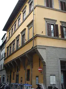 In this house, in 1631, the Bolognese man of letters Agostino Coltellini formed a sodality with the aim of bringing together «in virtuous conversation» the young people who had emerged from the school of Humanities, which from 1635 became the Academy of Apatists. A tradition[2] attributes, without foundation, the palace to Michelangelo Buonarroti, or doubtfully to Baccio d'Agnolo.[3]