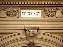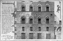 The large building, erected to a design by architect Vincenzo Micheli (1895), defines itself as a scenographic backdrop to the square, laid out from 1883 with the destruction of the Mercato Vecchio and the Jewish pond. Beyond its being a palace, the architecture transcends the need to offer a civil dwelling building in the bourgeois sense, to become a monumental urban sign, and impose itself through the great archway leading onto Via Strozzi, developed to include the two orders of the façades of the lateral buildings, each of which is developed for a further six axes, the last of which is overhanging. Each of these lateral bodies then develops deeply into the respective blocks, two internal courtyards towards via Brunelleschi, and an elongated one towards via Pellicceria. The wide and high archway with the large central body, adorned with statues and crowned by the plastic group of the Italy enthroned accompanied by the figures of Art and Science (removed in 1904), framed the equestrian statue of the king Victor Emmanuel II of Savoy, placed in the centre of the square and later moved to the Piazzale delle Cascine.[4] The three statues were mockingly renamed by the Florentines with the names of three prostitutes of the period, as can be found in some satirical sonnets of the time by Vamba and others: the Starnotti or Schiccherona, a tenant of Russian origin whose surname was Starnowka; then the Cambarbini and the Trattienghi.[5]