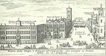 In 1675 the façade was frescoed (but such work was lost in the 19th century), above the loggia, by Francesco Ferrari, who depicted Charlemagne on a throne flanked by paladins on horseback.[5]