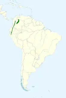 It is found in Colombia, Ecuador, Peru, and Venezuela. Its natural habitat is subtropical or tropical moist montane forest.