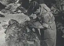 This was the last execution conducted in Palmiry in 1940 for which circumstances are at least partially known. However, during the postwar exhumation, three mass graves filled with 74, 28, and 24 corpses respectively, were found at the forest glade. It is certain that first two of them were filled and buried in the winter of 1940, while the third one was probably dug in the winter of 1940 or 1939.[42] Polish historians were not able to determine the circumstances of those massacres. According to Regina Domańska, about 27 prisoners of Pawiak were executed in Palmiry on 4 December 1940.[43] According to Maria Wardzyńska, up to 260 people could have been murdered in Palmiry in the winter of 1940.[44]