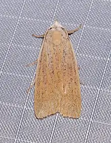 This moth has mottled brown forewings and white hind wings that are hidden when the moth is at rest.[3] The body is stout and the wingspan is about 35 mm.
