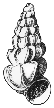 | Drawing of an apertural view of a shell of Paludiscala caramba. The height of the shell is 2.5 mm. | |