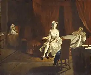| VI | ![]() | Pamela in the Bedroom with Mrs Jewkes and Mr B. | Volume I, Letter XXXII | Tate Britain | Tate | Misnumbered VII in the Tate catalogue, when it is the sixth scene in the order in which they appear in the novel. Mrs. Jewkes has forced Pamela to share a bed with her. In the left background is Mr B., who in a few moments will get into bed disguised as his own housemaid Nan and attempt to rape Pamela. |