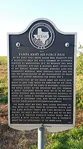 In 1982 a Texas Historical Commission historical marker was placed near the site, at the intersection of TX 152 & Farm to Market Road 1474. All that remains of Pampa Army Airfield today is the concrete water tower, a single hangar, and a broken parking apron. The runways, taxiways, and most of the streets of the administrative area are gone. The main entrance to the base can be found, and the outlines of the parade ground still exist. A few postwar agricultural buildings use the concrete foundations of their World War II predecessors, and the occasional concrete foundation of a wartime building is found. Most of the administrative area consists of farmers fields or scrubland.
