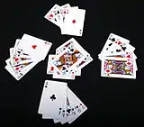 Pan is a card game of Polish origin, using a small French pack (cards from 9 to A are used). Whoever gets rid of their cards first wins the game but one can play only cards of higher or equal value than the one at the top of the stack.