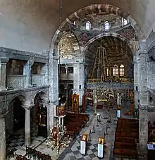 Panagia Ekatontapiliani (literally the church with 100 gates) or Panagia Katapoliani is a historic Byzantine church complex in Parikia town, on the island of Paros in Greece. The church complex contains a main chapel surrounded by two more chapels and a baptistery with a cruciform font.