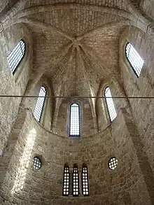 The Byzantine church was remodeled sometime in the first half of the 14th century; this was likely is due to a repair due to the possible collapse of the middle nave with the dome during the earthquake of 1303.[1] The archdiocese of Rhodes was in great poverty at the time, and could not afford the reconstruction of the church. Thus the help of Pope John XXII was asked, who seems to have provided funds for the church. In honour of his contribution they placed his coat of arms next to that of the Hospitaller Grand Master Hélion de Villeneuve.[1][3]
