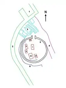Schliemann left many finds partially exposed in the ground, and several trenches unfinished.[67] Stamatakis returned to Mycenae early in January 1877.[68] Following the observation of a trench to the south side of the Grave Circle, Stamatakis excavated and discovered, along with Vasilios Drosinos, Schliemann's surveyor,[44] the remains of the so-called "Ramp House", including a treasury of gold vessels, jewellery and a signet ring.[69] This assemblage, known as the "Acropolis Treasure", has been interpreted as the contents of a looted shaft grave.[44] Much of its material was imported, showing connections between Mycenae and Central Europe.[69] Another major project undertaken by Stamatakis in this period was the systematic photography of the finds and remains at Mycenae.[70]