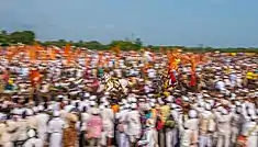 The concept of Dindi (Marathi: दिंडी procession) or troupes of warkari devotees was introduced by Haibatravbaba in the early 1800s.[16] A diṇḍī is a group of Hindu devotees of one caste or village who are part of a larger palkhi going to a holy site on pilgrimage. Some religious institutions and temples also have their own Dindi. Accommodation, meals and other facilities to warkaris are provided through their respective Dindi. Managing members of a Dindi usually travel ahead to make arrangements for food and shelter at their next stop. All registered Dindis are numbered and assigned their place in the procession. Some walk in front of the palkhi and others behind it. During their march, flag and banner-carrying members are at the front of the troupe, and the drummer is at the center of the Dindi.[17]