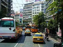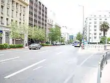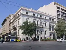 Panepistimiou Street (Greek: Οδός Πανεπιστημίου, "University Street", named after the University of Athens, the central building of which is on the upper corner) is a major street in Athens that has run one way for non-transit vehicles since 2002 from Vasilissis Amalias Avenue, Syntagma Square and Vassilissis Sofias Avenue to Omonoia Square in which is now a pedestrian crossing and before an intersection. Its total length is about 1.2 km. The street was formally renamed as Eleftherios Venizelos Avenue in 1945[1] (after the famous Prime Minister) but is still usually known by its historical name. It has six lanes, of which five are for traffic and one eastbound lane for transit buses only. Most of the street runs almost diagonally from southeast to northwest.