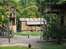 The biological research station Panguana was founded in 1968 by the biologists Maria Koepcke and Hans-Wilhelm Koepcke[1] and was originally only designed for a period of 5 years of field research.[3] As accommodation originally served a wooden cabin, which was abandoned by locals. It was standing on stilts, with a roof of palm leaves (see picture) and an additional kitchen hut next to it. Later it was replaced by a larger house and another was added.[1][4] Since 2000, her daughter, Juliane Diller, has been running the station.[2] In her absence, the manager, Moro, is her representative.[5] Since 2003, there has been a co-operation between the Zoological State Collection Munich, where Juliane Diller works, and the Natural History Museum in Lima, Peru.[6] Through sponsoring by the "Hofpfisterei" in Munich, the area of the station has been enlarged several times over the past few years by the acquisition of adjacent lands.[1]