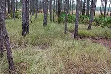 This grass grows in seepage bogs on the Lake Wales Ridge and other ridges in central Florida, an area of high plant endemism. It occurs on moist slopes that receive moisture from areas at higher elevation. It may be found near ponds in Florida scrub, or scrubby habitat, and in marshy flatwoods.[1] Cutthroat grass communities are heavily dominated by the cutthroat grass species. They occur in a number of habitat types, but all are dependent on wildfire for their natural maintenance. Fire keeps the open grassland free of large and woody vegetation. The most distinctive cutthroat grass community is the cutthroat seepage slope, a range of microhabitat types defined by elevation and the water table.[3]