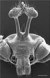 Panjange is a genus of leaf-dwelling spiders in the family Pholcidae, widely distributed in the islands of Southeast Asia from Borneo and the Philippines to northern Australia. Panjange spiders exhibit some of the most extraordinary morphology among Pholcidae. Males of most species have eye stalks, sometimes with long pointed processes; males of some species have unusually elongated pedipalps, which in spiders function as copulatory organs; and females of some species have external portions of their genitalia strongly folded and extensible. The biological significance of these sexual modifications remain unclear.[1]