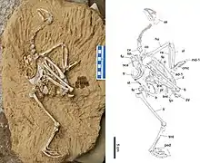 Holotype specimen with diagram; the grey parts show plaster reconstruction