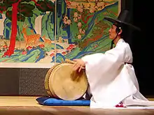 A gosu (literally "drummer") is a drummer in performances of pansori, a form of traditional Korean narrative/theater that is usually performed by just two musicians: a solo singer and a drummer. The gosu supports the sorikkun, or singer, by providing rhythms with a soribuk (pansori drum), a shallow barrel drum with a pine body and two cowhide heads. Impromptu short verbal sounds made by the gosu, called chuimsae, also play an important role.