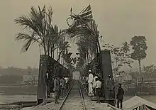 A first bridge for crossing the river was built in 1901 under the administration of the British together with other iron bridges in Kimanis and Membakut.[7] However, it was swept by strong floods into the river where it was replaced with a new iron bridge but also damaged by another floods in 1903.[8] A ferry service was temporarily made while the bridge undergoing repair. In 1904, another strong floods damaging the currently repaired bridge with most of its structure been swept away. A temporary bridge constructed in November 1908 also being swept away by floods.[9] Finally in December 1908, a new bridge was constructed but again damaged by floods in 1913.[10] In 1915, the railway service finally make its way to the Papar town with the opening of a railway bridge.