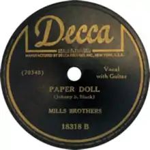 "Paper Doll" was a hit song for The Mills Brothers. In the United States it held the number-one position on the Billboard singles chart for twelve weeks,[3] from November 6, 1943, to January 22, 1944. The success of the song represented something of a revival for the group after a few years of declining sales. It is one of the fewer than 40 all-time singles to have sold 10 million (or more) physical copies worldwide.