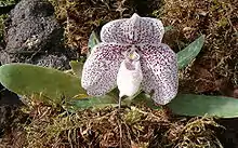 Paphiopedilum godefroyae is a species of orchid endemic to peninsular Thailand, Vietnam and Malaysia. This species is found just above sea level on limestone cliffs. The flowers are around 9 cm across, creamy white to light green. They flower from December to July.[1]