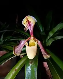 Paphiopedilum villosum is a species of orchid found Assam, southern China and the Myanmar states of Kachin, Kayar, Shan and the Upper Sagaing region. The population is declining across its range and the species is listed as vulnerable by the IUCN due to habitat degradation and poaching for the global plant trade.[1]