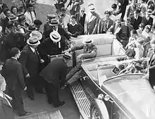 Roosevelt exiting a car during a campaign trip to Hollywood, California (1932)