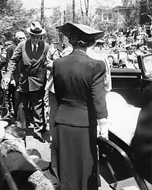 Roosevelt walking with assistance toward the dedication ceremony for the home of Woodrow Wilson (1941)