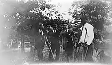 Roosevelt supporting himself on crutches at Springwood in Hyde Park, New York, with visitors including Al Smith (1924)