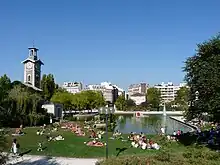 The central entrance gates to the park are topped by two sculptures of bulls by Isidore Bonheur, a note to the site's former use as a slaughterhouse.[3] An old gateway is crowned by a bronze horse's head. The old bell tower of the former fish market stands beside the pond, and the former shelter of the horse market is now used on weekends as a market for old books. The park also has a bust of Georges Brassens made in 1989 by the sculptor André Greck.[4]