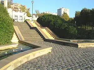 The Parc de Belleville is located on the hill of Belleville, its 108 metres making it the highest park in Paris.[1][2] At the summit of the park, an almost thirty-metre tall terrace provides a panoramic view of the city. The park was conceived by the architect François Debulois and the landscaper Paul Brichet. It was inaugurated in 1988.[3]