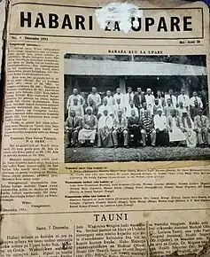Moses Seenarine writes of the contribution of Pare women in the struggle: 'The Pare women's uprising in northwest Shambaai, Tanzania, occurred in early January 1945 and continued with demonstrations into 1946, involving thousands of women. It began in Usangi, one of the chiefdoms, when the district commissioner arrived for discussions with the local chief. A crowd of hundreds (if not thousands) of women appeared, demanding an explanation of mbiru, a system of graduated taxation. When the commissioner tried to leave without addressing the women, they became enraged and mobbed the assembled officials. Two days later, women surrounded the chief's house singing songs, and ultimately stoned officials and battled police.' The Mbiru protest by the Pare people refusing to pay the colonial tax was eventually led by Paulo Kajiru of Mamba. The Pare eventually managed to defeat this tax system and went back to the flat rate of tax in 1947.[13] This remains as an important historical event in Tanzania.