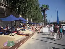 Initially there was a single beach on the Rive Droite. In 2006 a second beach was added on the Rive Gauche, and the scheme's name changed from singular to plural.[1] Unlike many beaches in France, topless sunbathing is not permitted. Swimming in the Seine is also not permitted, for safety reasons.[2]
