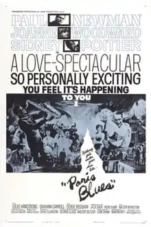 Paris Blues is a 1961 American musical romantic drama film directed by Martin Ritt, starring Sidney Poitier as expatriate jazz saxophonist Eddie Cook, and Paul Newman as trombone-playing Ram Bowen.[2][3] The two men romance two vacationing American tourists, Connie Lampson (Diahann Carroll) and Lillian Corning (Joanne Woodward). The film also deals with American racism of the time contrasted with Paris's open acceptance of black people. The film was based on the 1957 novel of the same name by Harold Flender.[4]