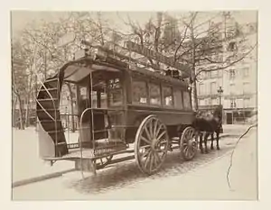 At the beginning of the Belle Époque, the horse-drawn omnibus was the primary means of public transport. In 1855, Haussmann consolidated ten private omnibus companies into a single company, the C.G.O. (Compagnie générale des Omnibus) and gave it the monopoly on public transport. The coaches of the CGO carried twenty-four to twenty-six passengers and ran on thirty-one different lines. The omnibus system was overwhelmed by the number of visitors at the 1867 Exposition, thus the city began to develop a new system of tramways in 1873. The omnibus continued to run, with larger cars that could carry forty passengers in 1880, and then, in 1888–89, a lighter vehicle that could carry thirty passengers, called an omnibus à impériale. The horse-drawn tramway gradually replaced the horse-drawn omnibus. In 1906, the first motorized omnibuses began to run on Paris streets. The last horse-drawn omnibus run took place on January 11, 1913 between Saint-Sulpice and La Villette.[35]