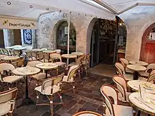 Coffee was introduced to Paris in 1644 by Pasqua Rosée, who opened the first café in Paris on Place Saint-Germain,[3] but the concept did not become successful until the opening of Café Procope in about 1689 in rue des Fossés-Saint-Germain, close to the Comédie-Française.[4] The café served coffee, tea, chocolate, liqueurs, ice cream, and confiture in a luxurious setting. The Café Procope was frequented by Voltaire (when he was not in exile), Jean-Jacques Rousseau, Diderot and D’Alembert.[5] Cafés became important centers for exchanging news, rumors and ideas and were often more reliable than newspapers.[6] In 1723 there were about 323 cafés in Paris; by 1790, there were more than 1,800. They were places for meeting friends and for literary and political discussion.[7] Hurtaut and Magny wrote in their ‘’Dictionnaire de Paris’’ in 1779: "One gets the news there, either by conversation or by reading the newspapers. You don’t have to encounter anyone with bad morals, no loud persons, no soldiers, no domestics, no one who could trouble the tranquility of society."[8] Women rarely entered cafés, but women of the nobility sometimes stopped their carriages outside and were served inside the carriage with cups on silver platters. During the Revolution, the cafés turned into centers of furious political discussion and activity, often led by members of the Revolutionary clubs.[9] Following the French Revolution and the Napoleonic Wars, billiard rooms were added to some famous 18th-century cafés in Paris and other cities.[10]