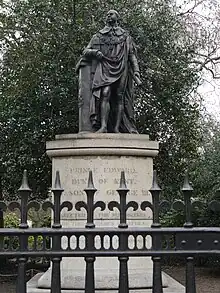 Just inside the garden railings, facing the top of Portland Place, is a bronze statue of Queen Victoria's father, Prince Edward, Duke of Kent and Strathearn.[15] Sculpted by Sebastian Gahagan and installed in January 1824, the statue is seven feet two inches tall and represents the Duke in his Field Marshal's uniform, over which he wears his ducal dress and the regalia of the Order of the Garter.[16]