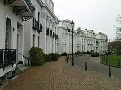 Initially planned to be given the name Royal Park Crescent, the Royal was dropped, perhaps when UK-wide recession stopped building in the 1830s.[3] It had originally been intended to extend the building further to the west[4] to line up with the Swiss cottages and take the terrace to 22 houses.[2]
