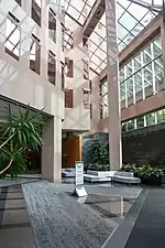 The Postmodern architecture of the building is expressed through its pink granite facade adorned with flush-mounted copper-glazed windows that match the granite's appearance. The building bears many similarities to the Brookfield Place in New York City, which was constructed around the same time.