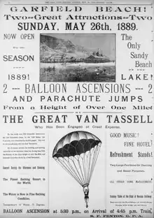 Van Tassel toured the American west, providing balloon ascensions at locations in Utah,[10] the northwest,[11] New Orleans,[12] California, Colorado, Kansas City, Missouri, Oregon, Washington and other locations in the west.[13] In Scientific American he suggested the possibility of a transcontinental balloon voyage across North America in 1886, something unheard of at the time.[14] Together with Thomas Scott Baldwin, Van Tassel co-invented a parachute, used by Baldwin to make the first parachute jump in the western United States on January 30, 1887 at San Francisco.[15] In competition with other daredevils such as Baldwin, Percival G. Spencer, James Price, and others, he later toured the world with his Van Tassel Troupe, associated with balloon ascensions and parachute jumps. His troupe is credited with the first successful parachute jump in Hawaii,[16][17] first balloon flights and parachute jumps by women in Australia,[18] early balloon flights in India,[19] the first flight in Bangladesh, Sri Lanka, and other locations in southeast Asia. Many of these events also helped to pioneer women's efforts in early aviation as a part of the Troupe.[20][21][22]
