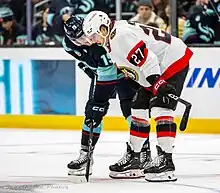 After the AHL season was concluded, Kelly was called up to Ottawa in May 2021. He made his NHL debut on May 12, 2021, against the Toronto Maple Leafs in the Senators' final game of the 2020–21 NHL season. He scored on his only shot in the game despite playing 7:32 minutes.[9] Kelly remained with Ottawa following training camp at the beginning of the 2021–22 season, playing as the team's fourth-line center.[10] On October 12, 2021 Kelly signed a two-year contract extension.[8] He was assigned to Belleville on October 24, 2021.[11] He was recalled on November 6 after Tyler Ennis became ill.[12] After playing in his eleventh game with the Senators, he was re-assigned to Belleville on November 28.[13] He served as an alternate captain with Belleville.[14] He played in 22 games with Belleville registering nine points before being recalled by Ottawa on February 8, 2022.[15] He returned to Belleville on February 11.[16] Kelly was brought back up to Ottawa for the fifth time on April 5 after Mathieu Joseph was injured. Kelly had spent the majority of his time in Ottawa on the fourth line, but after being called up, saw some time on Ottawa's top line with Brady Tkachuk and Josh Norris.[17] The 2022–23 season marked Kelly's first as a regular in the NHL. He played mainly on the fourth line with Austin Watson and Dylan Gambrell.[18] On March 23, it was announced that Kelly had suffered a broken kneecap and would be out for the remainder of the season. He finished with one goal and four points in 55 games.[19][20]