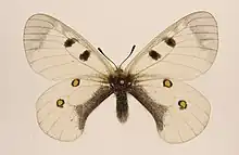 Similar to Parnassius ariadne but the forewing without submarginal macular band, the vitreous margin is considerably widened, there being often a blackish spot before the hindmargin; ocelli of hindwing reddish yellow, distal margin glossy grey. The female strongly marked, partly powdered with blackish scaling; costal spot of forewing enlarged to an abbreviated band; the ocelli of the hindwing sometimes connected by a black line. Underside without basal spots. In ab. trimaculata Schaposchn. the anal spot bears sometimes a distinct red pupil, being ocellus-like.[1]