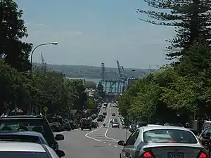 Looking north-north-west down Parnell Road, Ports of Auckland and Waitematā Harbour visible in the distance