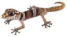 This lizard has brown dorsal colors with lighter ochre crossbands which fade at the flanks, distinctly visible as they are bordered by darker colors. These crossbands are even more distinct in juveniles. Contrasting darker brown markings are present across the body. The flanks and underside are a lighter, creamy color than the dorsum.[4]