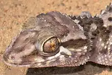 This species is large for a member of the Paroedura bastardi complex, commonly growing over 7 cm in snout–vent length, with large individuals reaching more than 8 cm. The head is wider than the neck, being comparable to the torso in width. Marked median depressions are present on the well-developed canthal ridges, and the ear opening is a vertical slit. The rectangular rostral scales, over twice as wide as they are tall, are separated from the nostrils by prenasals.[4]