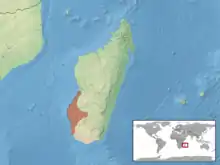 This species is endemic to Madagascar, and is found in deciduous dry forests in the south and southwest of the island nation. Known specimens were collected at night, indicating it is nocturnal, and it can be seen on the ground or climbing inches above the ground onto vegetation. This lizard has an estimated extent of occurrence of 42,726 km², and is present at elevations between 30 and 800 m. When it was initially described, it was known only from Dabara Forest and the nearby town of Manja in Toliara Province.[2] Later surveys would discover it in other locations such as Kirindy, Mikea, Tsimanampetsotsa and Isalo.[3][4]