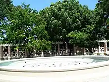 The middle area is the largest area of this plaza. It contains a very large fountain and behind the fountain are 24 "kiosks" with fountainettes. Sixteen of these fountainette kiosks are dedicated to illustrious Ponce citizens in 16 different areas of endeavor. Moving from left to right, these twelve areas are: History, Politics, Journalism, Writing, Architecture, Citizenship, Medicine, Music, Craftsmanship, Education, Sports, Plastic Arts, Law, Business, Ponceñistas, and Theatrical Arts. Each fountainette kiosk then has one or more plaques with the names or those being honored engraved on them.[3] Every few years the municipal government announces that new names are to be added to the list and petitions its citizens for suggestions.[4]