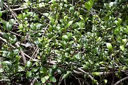 The leaves of P. heterophylla are variable in size and shape, both in all stages of its life.[9] The leaves of seedlings and juvenile plants are largely diverse, and a range of small and round, long and narrow and irregularly shaped leaves can all be found mixed on the same plant.[7] In adults, the leaves are described as "opposite, rather shiny and rather dark green from above, much paler underneath, more or less smooth-edge but often somewhat wavy edged, more than 1 cm wide, often 2, 3, or 4 cm wide and up to 10cm long".[7] While the leaves of adult plants are usually shorter and broader than in juveniles, they are still variable in shape.[9] The leaf types can narrowly be defined as small round, long narrow and moderately broad and oblong.[10]