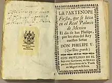 Partenope is an opera in three acts by Manuel de Zumaya. Zumaya adapted the libretto himself from a Spanish translation of Silvio Stampiglia's Italian libretto which was first set for performance in Naples during 1699 with music by Luigi Mancia.[1] All told, Stampiglia's libretto was used by a variety of composers for more than a dozen operas that were produced all over Italy, including versions by Leonardo Vinci and George Frideric Handel.[2] Zumaya's version was commissioned by Viceroy Fernando de Alencastre Noroña y Silva and produced at the viceroyal palace in Mexico City on 1 May 1711. The production is the earliest known full opera produced in North America and the first opera written by an American-born composer.[3] However, Parténope is not the earliest opera to be performed in the New World, as some sources have reported. That distinction belongs to Tomás de Torrejón y Velasco's La púrpura de la rosa, which premiered ten years earlier in Lima, Peru.[4]