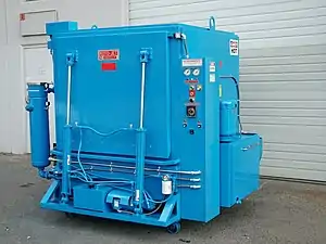 A parts washer is distinctly different from a pressure washer in that parts washers typically clean parts automatically in an enclosed cabinet, while pressure washers typically have a single spray jet mounted at the end of a manually operated wand. Modern industrial technology makes it possible to combine many parts of the finishing process into one. As an integrated part of the manufacturing process, automatic parts washers are able to load, wash, rinse, dry and unload parts in an automatic cycle.